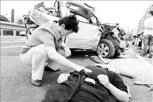 5月29日15时25分,青银高速青岛方向132公里处突发车祸,一辆青岛牌照的白色丰田轿车与一辆大货车相撞,丰田轿车抵不过“大块头”被拧成了麻花,车内3名人员全部受伤,就在大家焦急等待救护车时,同样被堵在高速路上的国务院参事、卫生部人事司原司长秦小明和同行人员一起对伤者进行了急救,直到120急救车赶到现场后,秦小明一行才离开。中新 摄