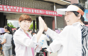 昨天,周口市直考区周口一高初中部考点,一位母亲和要走进考场的女儿击掌加油。当日,2011年高考拉开序幕,我市有90000多人参加高考。晚报记者 朱海龙 摄