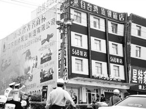 发生倾斜的楼房,位于靖江市南环姜八路西侧,楼房呈南北走向,目前为“快捷568旅店”。昨天上午,记者赶到现场看到,“快捷568旅店”共4层,最底层是门面房,楼面上方写着“来自台湾连锁旅店”,与快捷568旅店北侧相接的是 “星特家具城”。从侧面看,“快捷568旅店”与“星特家具城”已经完全错开,“后仰”大概20厘米左右。在楼房南侧面记者看到,事发4层楼建在一河堤上,相比于东侧地基,西侧已经明显下沉。