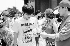 6月8日上午,在项城二高考点前,身穿红马甲的志愿者们面带微笑,向刚下考场的考生们递上一瓶瓶矿泉水。