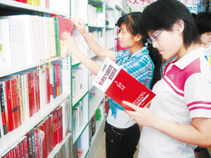 昨日,几位学生在一购书中心阅读红色书籍。随着“七一”临近,周口一些购书中心、新华书店等开辟的建党90周年红色书籍专柜受到读者热捧。《毛泽东与国民党爱国将领》、《中国共产党历史》等一批红色书籍和红歌音像制品的销量大幅增长。记者 王映 摄