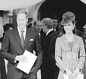 威廉王子和新婚妻子凯特·米德尔顿、弟弟哈里王子共撑一把伞,3人微笑步入教堂。米德尔顿一身藏蓝色锦缎裙装,戴同色系礼帽,格外引人注目。媒体报道,新王妃2009年曾穿这身套装参加好友的婚礼。