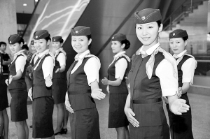 6月15日,在上海虹桥站,京沪高铁乘务员在展示迎宾礼仪。当日,京沪高铁乘务员形象展示暨教育培训情况介绍活动在上海虹桥站举行。京沪高铁乘务员在活动中演示了她们的培训项目,展示了京沪高铁服务新形象。新华社发