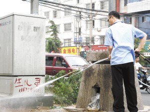 本报讯 在机器的轰鸣声中,强大的水流从喷枪中喷射而出,顷刻间,粘贴在灯杆、门头和地面上的“牛皮癣”“灰飞烟灭”。6月17日上午,记者在项城市西大街看到,一名城管队员用新购进的小广告清洗机清理小广告(如图)。