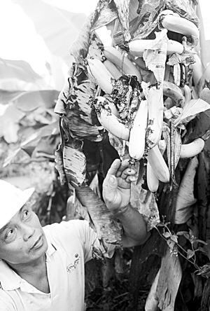 图为6月22日,海南省琼海市塔洋镇里文村村民符策涛在查看烂在树上的香蕉。新华社发