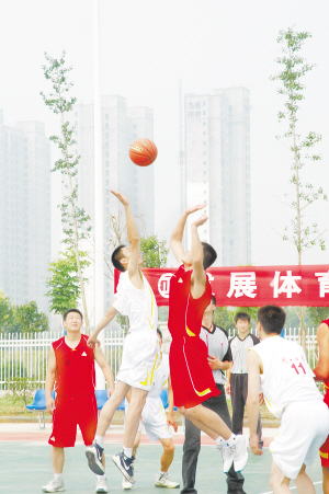 昨天,由周口市委市直机关工委、市体育局联合主办的庆祝建党90周年“亿正杯”市直职工篮球赛在市体育中心开赛。10支代表队将在3天时间内展开激烈角逐,以良好精神风貌为党的90华诞献礼。图为周口日报社代表队、市消防支队代表队在比赛中。