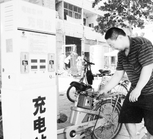 昨日,在商水县科技路上,一市民正用投币式充电器充电。据介绍,在这种充电站市民只需投币1元钱,就可快速充电10分钟,普通电动车可续行15公里。