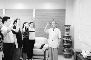 今年88岁,党龄70年的原周口地区体育运动委员会主任张金城日前应邀为周口市体育局机关党员上了一堂党课,并和大家一起在党旗下重温入党誓词。 晚报记者 李伟 摄