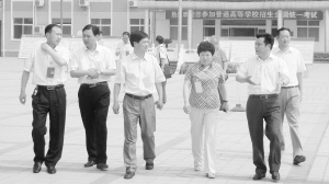 淮阳县委书记任连军(前右一)、县长胡景旭(右二)、副县长顾伟(左一)在该县教体局局长刘伯俊(左二)的陪同下视察考点。