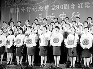 日前,中国银行周口分行隆重举办“庆祝建党90周年红歌会”,纪念党的90岁生日。员工们深情地演唱了《没有共产党就没有新中国》、《东方红》等15首经典红色歌曲。