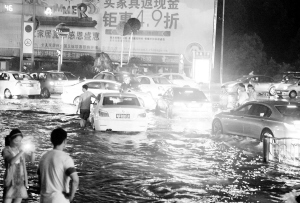 这场暴雨,让成都成为泽国,城区内上百处低洼之处,积水至人膝部和半米之深,到处可见有汽车泡在水里无法走动。
