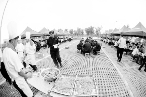 记者在现场看到,6位厨师忙得不亦乐乎:有人用大铲子翻炒着肉片,有人切黄瓜,有人清洗青菜,有人打米饭,有人分馒头,有条不紊,分工明确。前后仅用了1个半小时,就为现场的260多名民警备足备好了红烧肉、家常豆腐、凉拌黄瓜、鸡蛋汤、绿豆汤、馒头、米饭、蒸面条等可口的饭菜。厨师张东说:“这个野炊车有两个灶眼,用柴油做燃料,做饭比较快。”