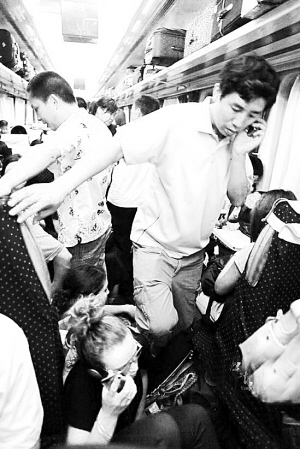记者于7月1日晚从3号车厢挤上前往北京的T110列车,感觉像上了早高峰公交。
