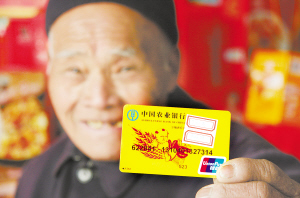 图为山东省枣庄市市中区光明路街道丁庄村80岁的李继友老人展示含高龄补贴的养老保险金领取卡。