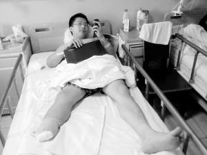 图:躺在病床上的王沛冉看上去依然很乐观(注:图片由王沛冉提供)。