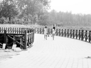 由公园径直向北走到环湖边,人们会看到一处环形的古色古香的栈桥式亲水平台,它可以让市民“零距离”地感受湖光水色。栈桥乍看像是实木的,可敲击后记者却发现它竟由混凝土建造的,只是外面刷了一层仿木色彩的涂料。“实木造价太高,而且比较‘娇气’,需要经常维护和更换,仿木的栈桥设计,不仅兼顾到了美观,更考虑到了后期管理的需要”。