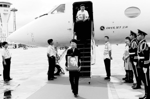 经过多方努力,12日早上朱枫家属从八宝山公墓捧出朱枫烈士骨灰。下午3时05分,从北京起飞的专机,缓缓地降落在宁波栎社国际机场。5分钟后,朱枫的外孙女徐云初手捧朱枫遗像,外孙女婿李扬抱着覆盖着党旗的朱枫骨灰盒,先后从飞机上走下(下图),烈士终于魂归故里。