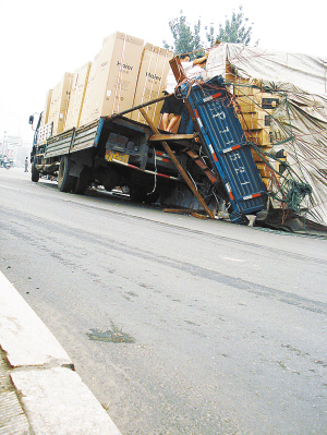 7月14日清晨,一辆载满家电的货车行至项城市区市标附近时发生侧翻,车上的家电洒落一地。据知情人介绍,货车是在转弯时发生事故的,损失在10万元左右。当天8时许,洒落的家电已被转运至安全场所存放。事故原因正在调查中。晚报记者 金月全 摄