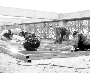7月14日是今夏入伏的第一天,项城市的最高气温达33摄氏度。当日上午,在项城市一施工工地,焊接工人头顶烈日,挥汗如雨,坚持工作。图为施工现场。