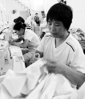 7月16日,50岁的农民钊勤(右一)在商水县魏集镇许寨村工业集聚区一企业车间正忙着加工服装。