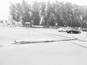 本报讯 继昨日本报刊发《施工挖断电缆线 造成停电一大片》的报道后,昨日我市市区又发生一起大面积断电事故:6时30分,一辆大吊车的吊臂不慎撞倒大庆路与文昌大道交叉口处的一根电线杆后,并导致周围的3根电线杆被拉断倒地,该事故造成沙颍河以北大部分区域停电。