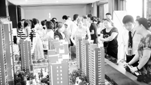 图为售楼大厅内市民在观看小区沙盘。