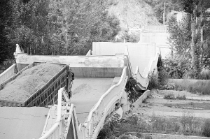 7月19日拍摄的北京怀柔宝山寺白河桥塌桥现场。当日零时40分,一辆载重超过160吨的严重超载货车在通过北京怀柔宝山寺白河桥时,该桥发生坍塌,未造成人员伤亡。
