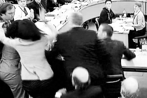 听证会进行时,一名男子突然从听众席站起,手拿一个类似泡沫刮胡膏盘子的东西砸向默多克,在默多克身后的妻子邓文迪(浅衣女子)迅速跃起,第一时间抬手准备给袭击者一巴掌。袭击者随后被警方带走。《金融时报》说,“我们正目睹折磨别人的人被别人折磨。”路透社表示,默多克在听证会上遭袭时妻子邓文迪的反应,可以用“如同蝎子般猛击”来形容。她未必会因此成为英雄,但她“和丈夫站在一起”的戏剧性行动让人印象深刻。通过展现自己的强硬一面,邓文迪向全世界展示了媒体大亨默多克虚弱的一面。她因此帮助默多克赢得了一些同情分。