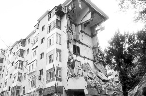 发生垮塌楼房位于哈尔滨市南岗区革新街与联部街交会处,记者在现场看到,发生垮塌居民楼共6层,其中右侧一部分已完全垮塌(上图),断裂的墙体散落地面,楼体垮塌部分涉及5户居民。
