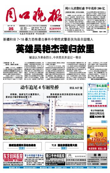 本报讯 7月23日,在新疆和田7·18暴力恐怖袭击公安派出所事件中英勇牺牲的武警新疆总队某部战士吴艳杰的骨灰运抵家乡扶沟县,存放于该县烈士陵园(吉鸿昌纪念馆原址)。