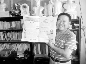 当日上午,在韩其功家中,韩其功一边向记者展示已经装订成册的《史诗·壮歌》特辑(如图),一边激动地说:“为了收集这些报纸,我让朋友一期期的帮助找,终于一期不漏地收集齐了报纸并装订成册。”