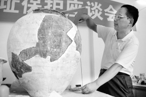 7月23日,在淮阳县平粮台博物馆,专家展示修复完工的一个超大陶瓮。