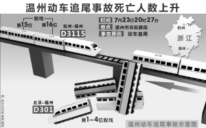 23日20时27分,北京至福州的D301次列车行驶至温州市双屿路段时,与杭州开往福州的D3115次列车追尾,造成D301次列车4节车厢从高架桥上掉落。