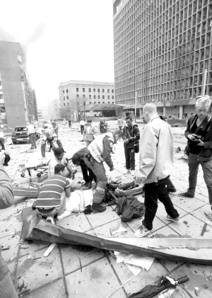 爆炸造成政府办公大楼楼面严重受损,几乎全部玻璃被震碎,楼底层向上冒出白烟。沿街数百米散落玻璃碎片和石屑,办公大楼周围的财政部大楼、石油部大楼、《世界之路报》编辑办公室等建筑也受到影响。