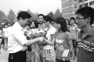 7月26日上午,淮阳一高隆重举行北大、清华等名牌院校录取通知书发放仪式。淮阳县教体局局长局长刘伯俊、淮阳一高校长王业生满怀喜悦,从邮政礼仪手中接过烫金的录取通知书,勉励学生们不辜负学校的辛勤培养和社会的殷切希望,学好本领,为淮阳百万父老争光!图为淮阳县教体局局长刘伯俊把北大、清华录取通知书和鲜花送到学生手中。