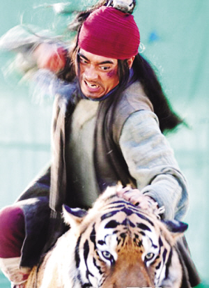 回首打虎往事,陈龙说:“我开始还以为是导演开玩笑呢,结果却真的被带到了马戏团里,我也不知道自己哪来的勇气骑上去打虎的。”陈龙说:“我看见一只六七百斤的大老虎趴在那里的时候,腿都哆嗦。”他告诉记者,拍摄打虎那场戏时,他是孤身进入虎笼,连驯兽员都在外面看着。驯兽员让他上去摸一下,结果摸虎的部位不对,老虎冲他大叫一声,吓得他躲在一边不敢再动。陈龙说,“不过喂了肉后,老虎很给面子,任由我抓着虎皮做出各种动作,当时我也完全忘记了危险性。这场戏拍完,竟满头是汗。”说到这里,陈龙颇有些自豪:“当时觉得自己就是武松。‘打虎’的勇气大概来源于自己不想留给这个角色遗憾吧。” (黄艳如)