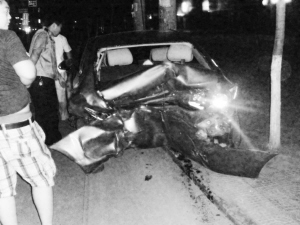 本报讯 7月25日深夜,在太康县城谢安路中段的快车道上,一辆黑色轿车先后与一辆红色轿车和一辆出租车相撞,巨大的冲击力造成3辆车不同程度损坏。