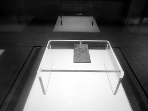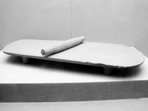 石磨盘长100厘米,宽44厘米,厚13厘米,以整块砂岩磨制而成,略成鞋履形,两头呈椭圆形,两边呈直线,上面平坦,下有4个圆柱状足 (石磨盘上的石棒是为了还原当时的劳作场景,后添加的)。“和裴李岗文化同类器相比,该石磨盘形体之大为迄今之冠。”市博物馆馆长周建山语透自豪。