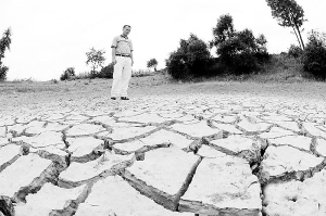 连日来,受连续高温和降雨偏少影响,湖南省各地旱情持续发展。据介绍,湖南娄底新化县等27个县(市)遭遇重旱,其中24个县(市)达到气象干旱特旱等级,约703万亩农田受旱,39万人、26万头大牲畜因旱饮水困难。上图为一位湖南省新化县村民在察看当地一处干涸见底的水塘。新华社发