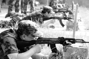 7月28日,商水县党政军有关负责人近百人,在周口军分区靶场参加了手枪、冲锋枪等课目的训练,用集体过“军事日”的方式,迎接建军节的到来。图为他们在进行冲锋枪比武。