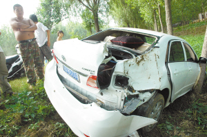7月27日15时许,在淮阳县东外环路一弯道处,一辆小轿车因车速过快刹车不及,控制不住方向冲入路沟中,并撞在一棵树上,轿车受损。看来,“十次事故九次快”是有道理的。晚报记者 杜欣 摄