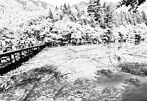 九寨沟最精华的步行路段是树正沟的树正瀑布到老虎海的栈道,这里的游客最多,但多集中在海子的东边。如果要避免拥挤,可以选择行走西边栈道。这条景观道不仅能将所有景色一收眼底,途中甚至可以在山林中看到不少才长出脑袋的蘑菇以及在林间嬉耍的松鼠。
