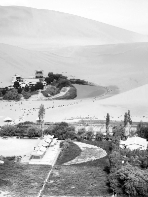 在甘肃省敦煌市鸣沙山月牙泉风景区内,月牙泉与人工栽种的月牙形花池互相映衬,成为一道美丽的风景(8月1日摄)。新华社发