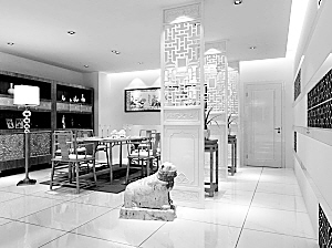 落地的光源显得格外清淡幽雅,灯罩的简约线条与餐桌呼应得相得益彰。浅淡古雅的灯光将整个餐厅之美若隐若现地倒影于光洁明亮的地砖上,仿若镜子般晶莹通透的水面,倒映着岁月的千山万水。