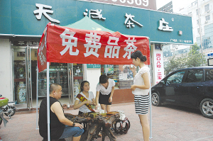 近日,在市区六一路口的天诚茶行门口,有个免费品茶的条幅特别醒目。原来天诚茶行为了在炎炎夏日让过往市民喝到清凉可口、降压降脂的茶水,特别设置了这个免费品茶点。此活动开展以来受到了市民的一致好评,他们希望有更多的爱心商家举办类似的活动。