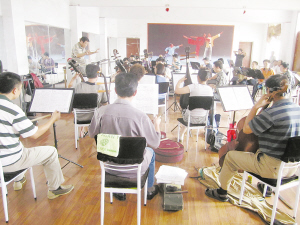 本报讯 “影视作品中,偶尔能看到身着统一服装,手持各种乐器的专业乐团演奏场景,高贵、华丽、气势磅礴,却离我们很远,因为我们本地没有这样的乐团,‘高雅艺术’自然与我们产生了距离。”一位周口文艺界人士曾这样说过。不过,这种局面很快就会成为历史。今年6月份,我市音乐界的多位知名人士一起组建了一家民族管弦乐团。上周日下午,记者来到乐团的训练场地,看到整洁明亮的大房间内,摆放着各种乐器。乐队成员随着指挥的手势,正在认真弹奏练习,《花好月圆》、《金蛇狂舞》、《赛马》,一曲接着一曲。