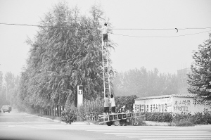 昨天, 周口东新区庆丰东路上,某公司的施工人员直接把梯子竖在道路中间架设电缆。梯子的一端搭在空中摇晃的电缆上,一端立在一辆三轮车上,如此架线像玩杂技,实在有些危险。