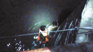 大闸桥墩下一名30岁左右的男子被困水中,一脸紧张,一手紧搂着救生圈,一手死死地抓着桥墩底座。距男子不足十米处即是提起的大闸闸门,稍有不慎,他就有被河水吞噬的危险。