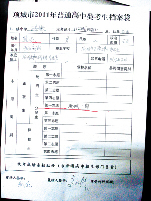 今年16岁的张杰,出生在项城市新桥镇李思庄行政村。3年前,如愿考入正泰学校初中部。张杰说,自上学以来,一直很向往项城一高,并暗下决心通过自己的努力实现梦想。今年6月底,在估分填报志愿时,他在正取生类别里填报了“分配生第一志愿:项城一高”。8月3日,记者从项城市教育局提供的张杰的报考志愿表(如图1)上证实了他的说法。