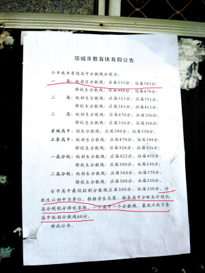 记者从项城市教育体育局针对2011年中招考试的公告(如图2)中了解到,今年项城一高的应届统招生分数线是533分,除此之外,还根据情况向一些初中学校分配了正取分配生名额。8月4日下午,杨湖南向记者证实,项城一高给正泰学校初中部划的分配生录取分数线是480分。